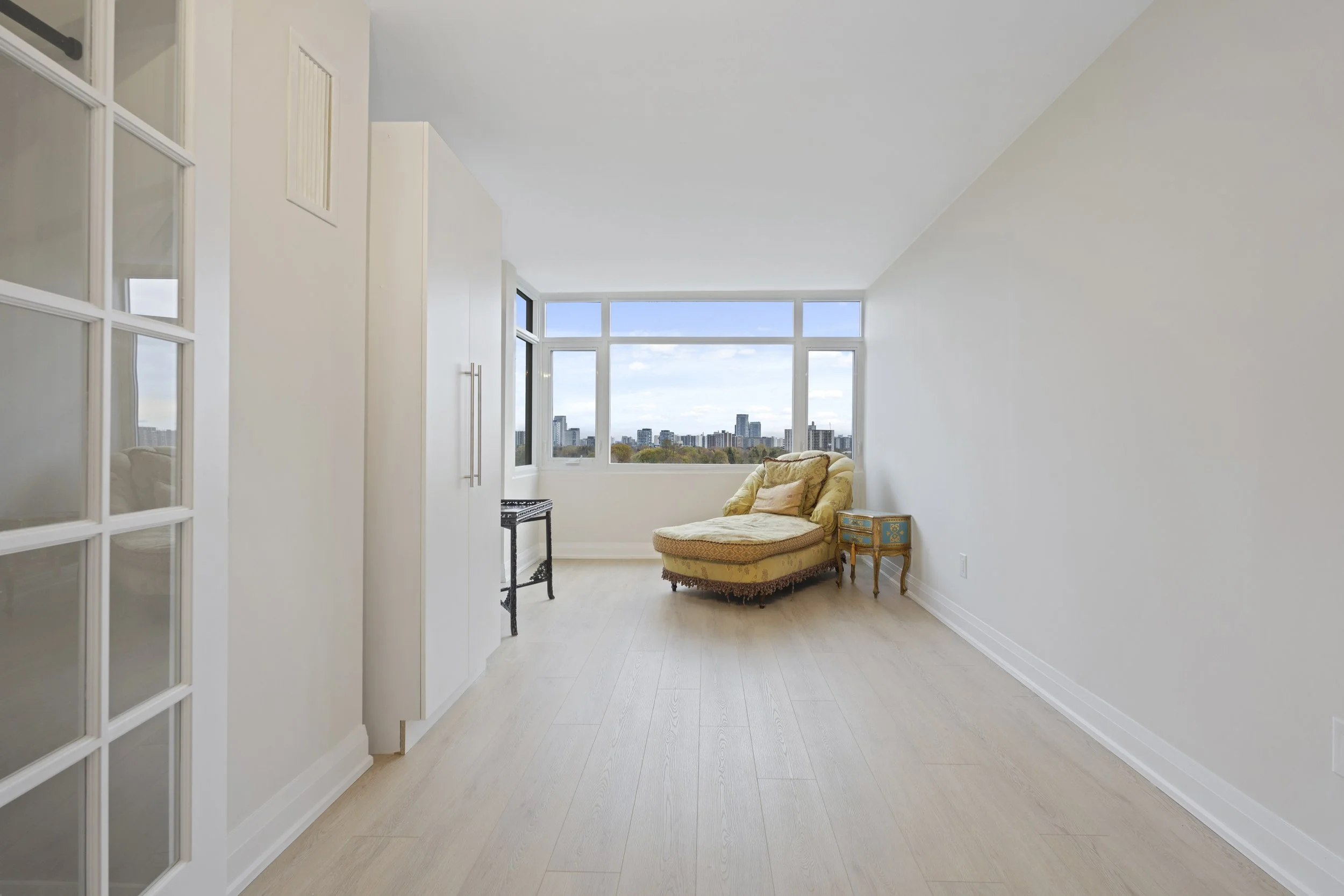 Situated in a highly desirable area, this massive suite has undergone a complete, tasteful renovation in 2025, offering a sophisticated, move-in-ready one floor home. This spacious floor plan currently offers three bedrooms and den. The two gorgeous new bathrooms have been transformed into spa-like retreats. The main living spaces are designed for seamless flow; the massive open-concept living, den and dining area is perfect for gathering and entertaining. The custom-designed new kitchen is a cook's delight, featuring sleek quartz countertops, pristine white shaker style cabinetry, and stainless-steel appliances. New enormous sunlight filled windows showcase captivating, unobstructed treetop vistas stretching across the green space to the south, with the vibrant cityscape visible in the distance.