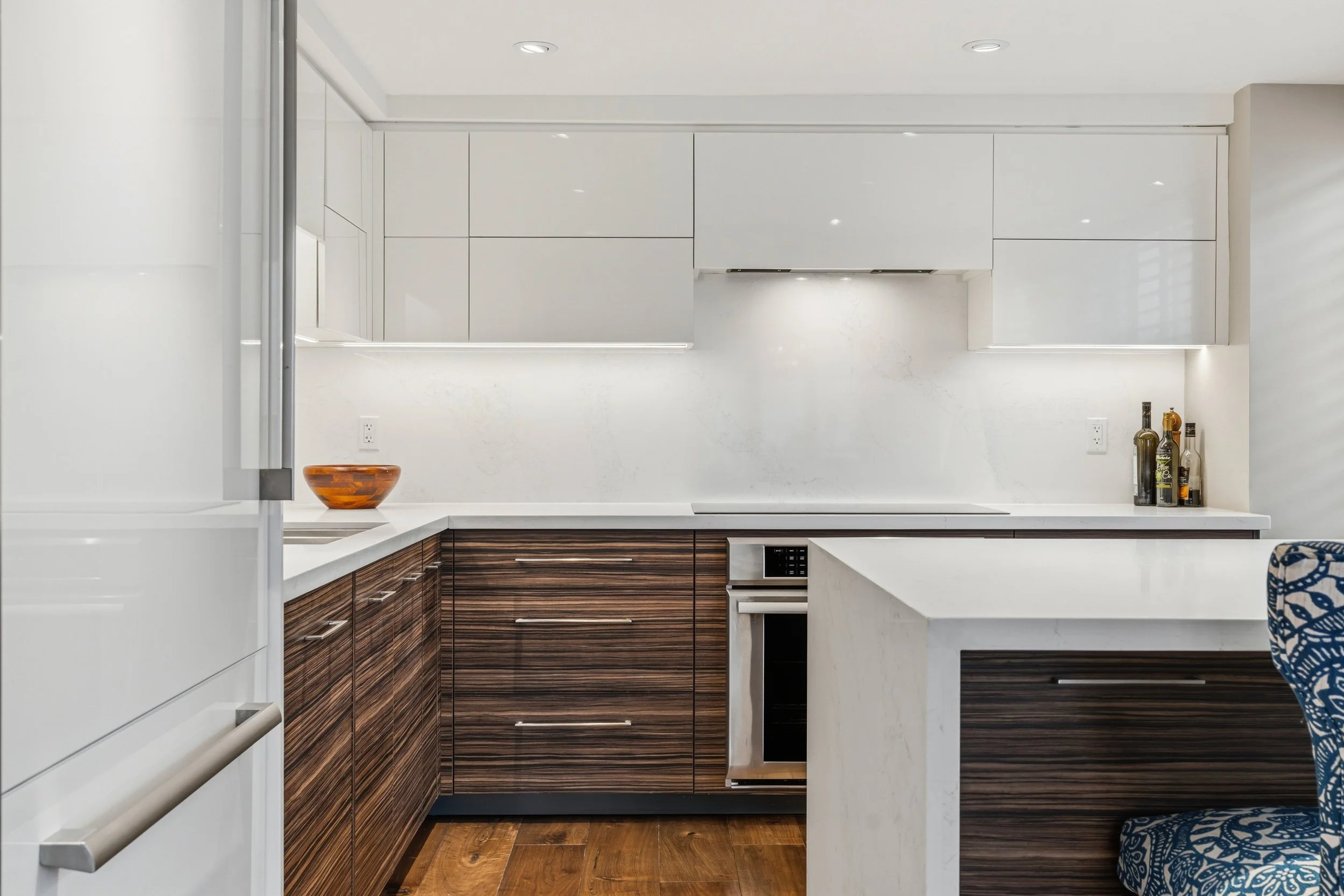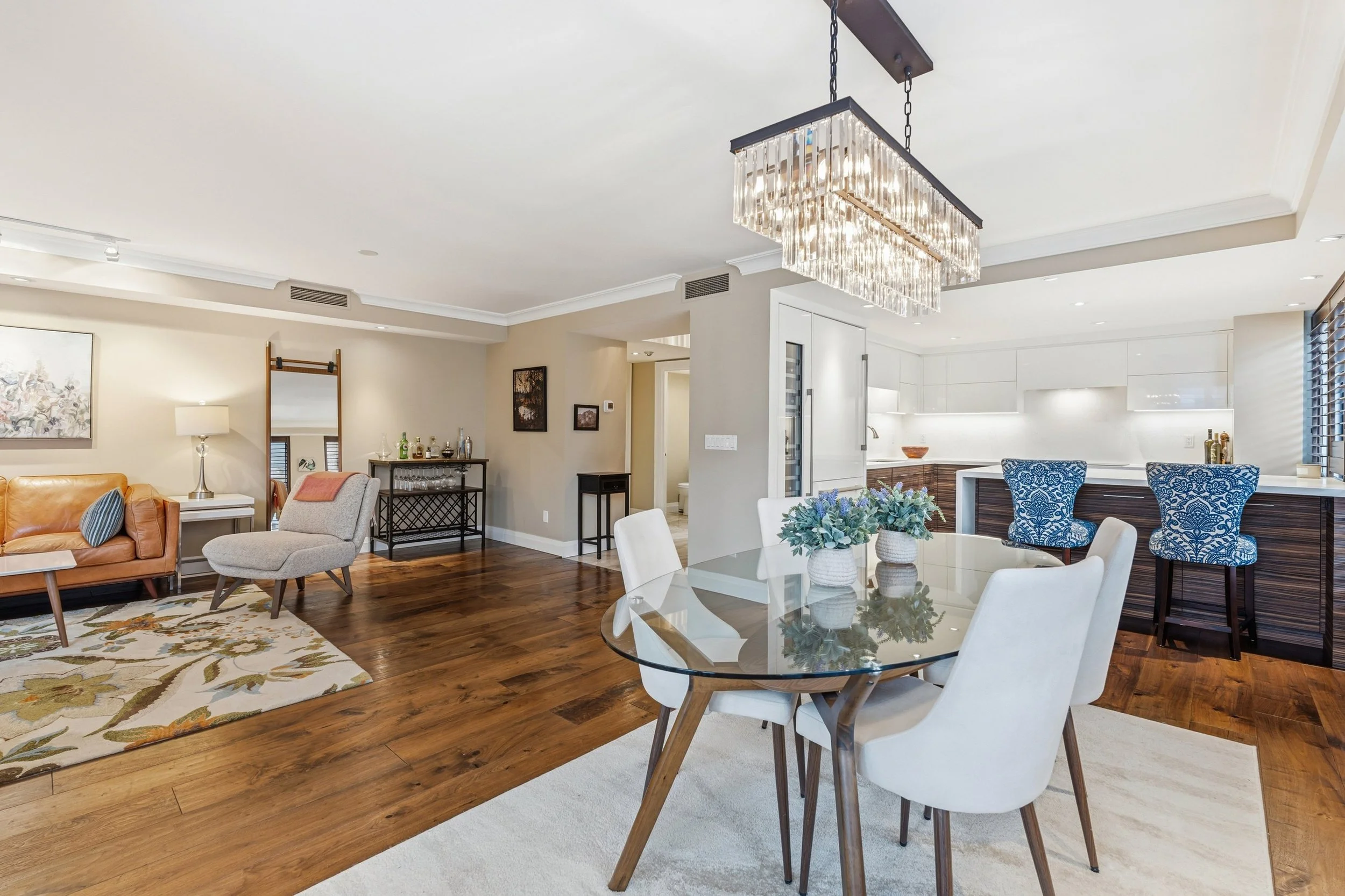 The open-concept layout seamlessly integrates the kitchen, dining, and living areas. The renovated kitchen is equipped with premium Thermador appliances, quartz countertops, a wine fridge, a large central island with breakfast bar seating, and excellent storage.