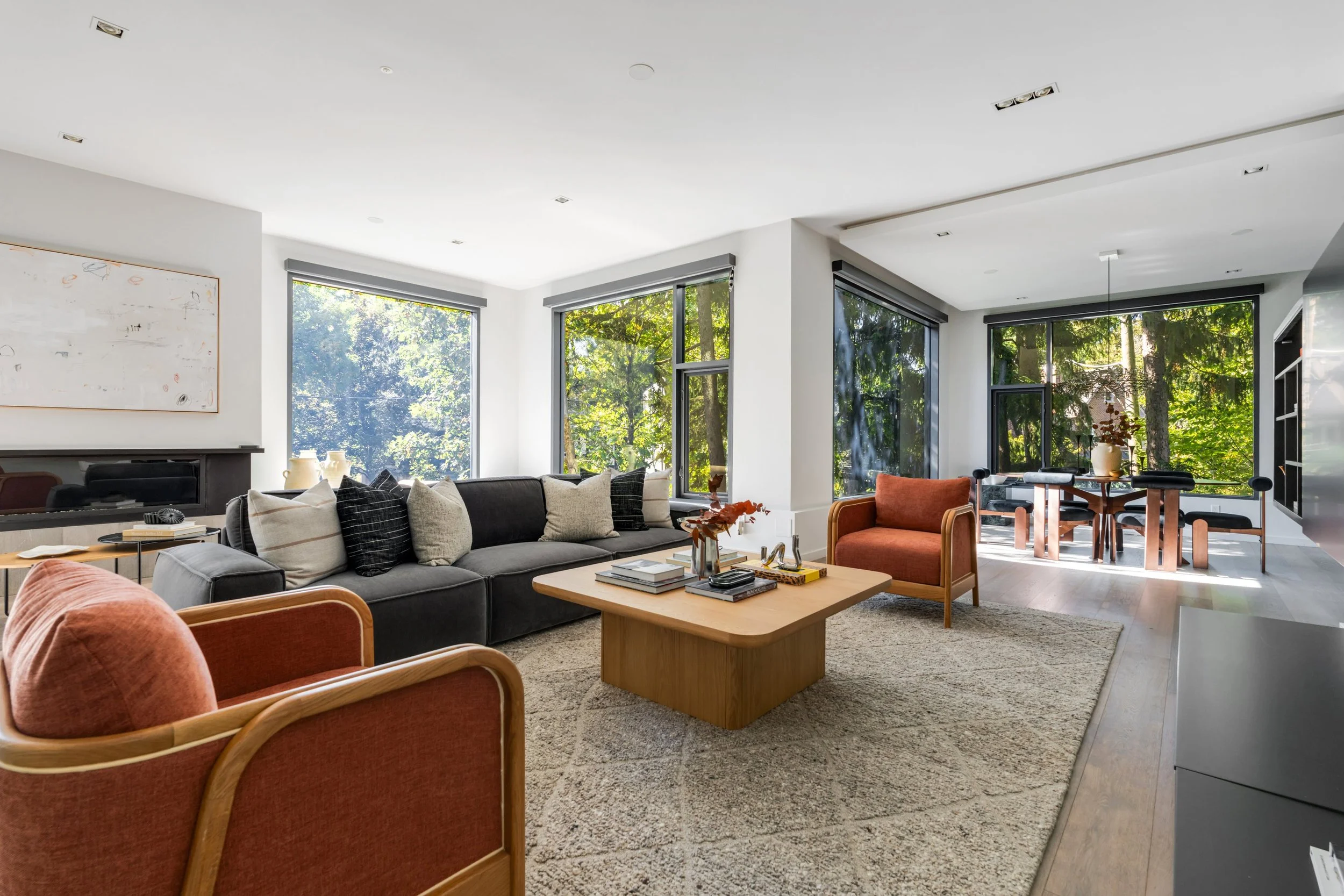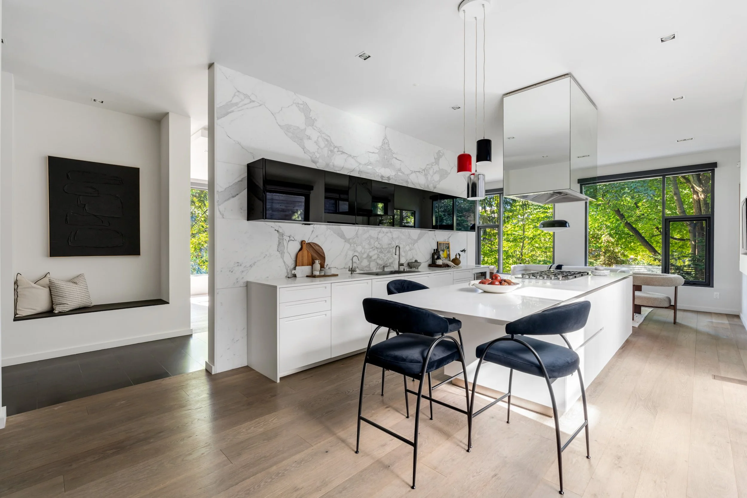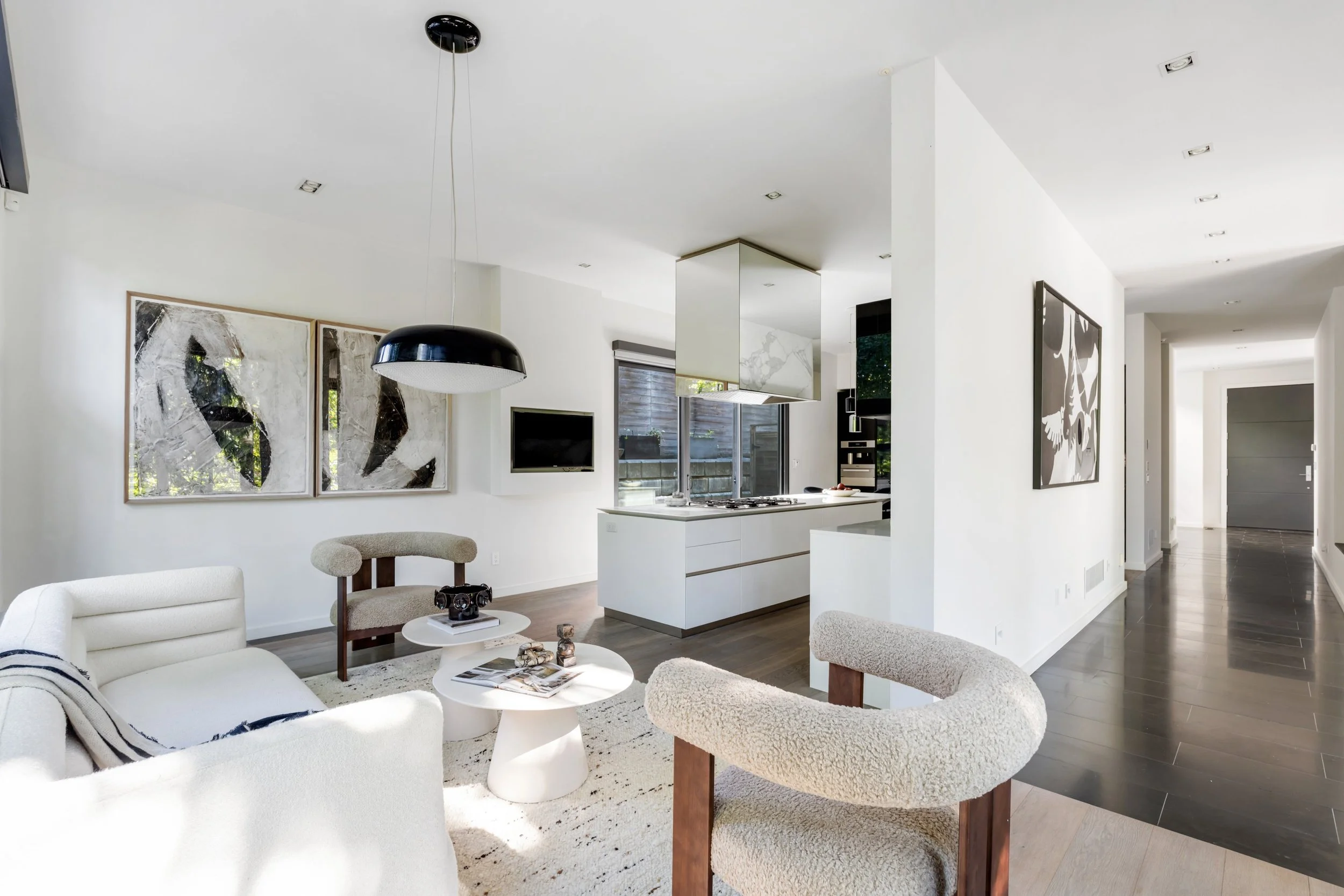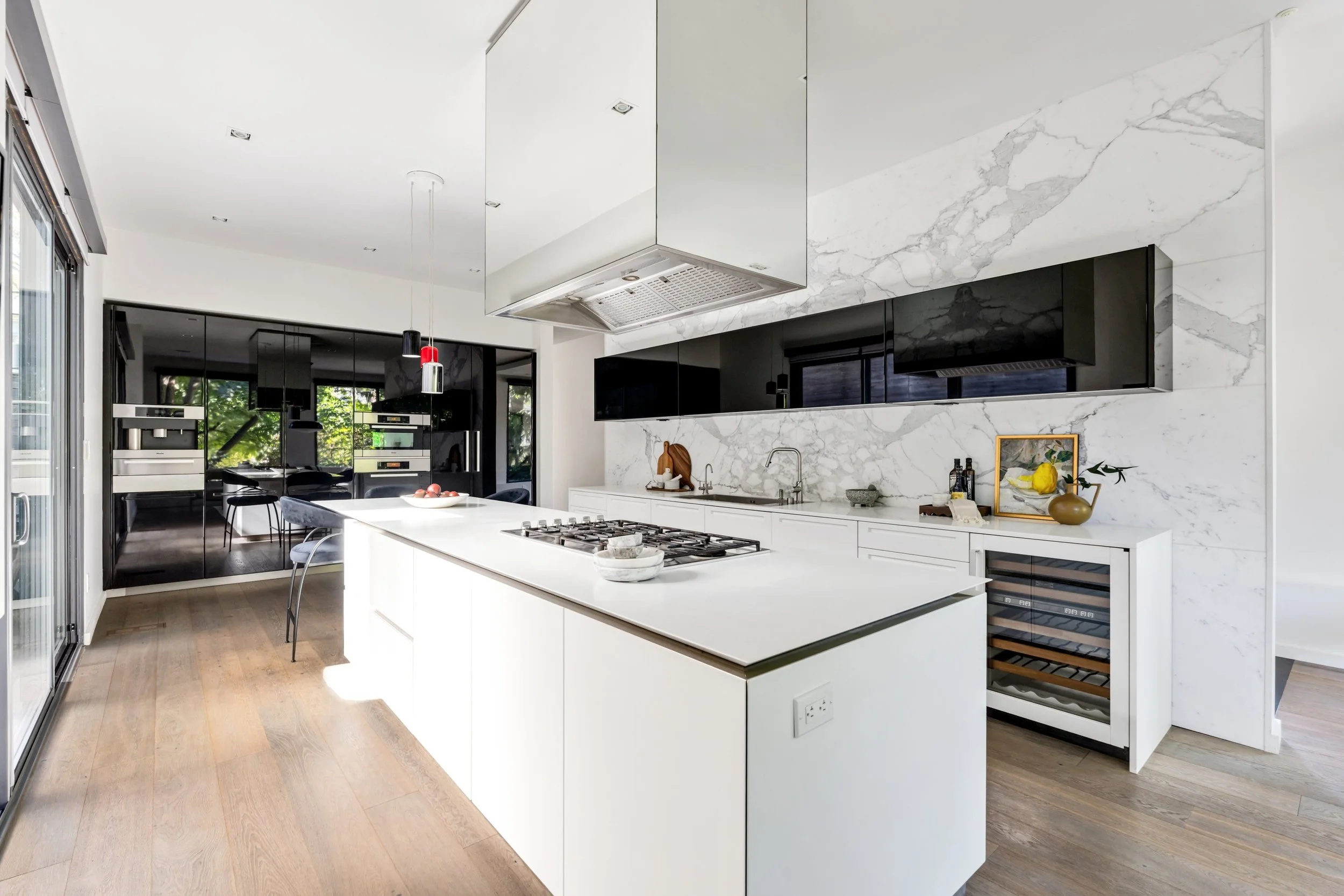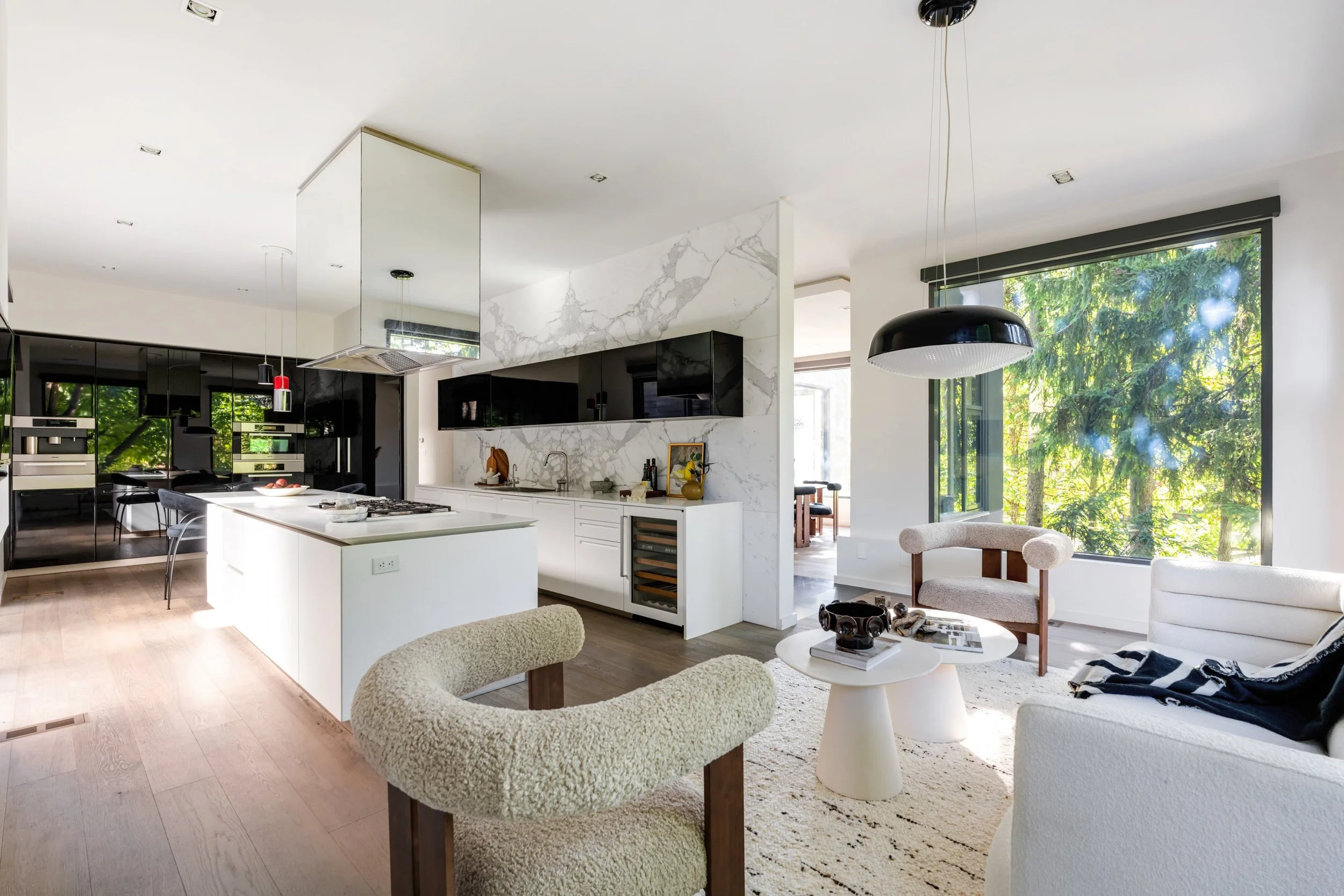 The home's design seamlessly integrates cutting-edge features with a practical layout. The nearly 2000 square foot open-concept main floor centres around a chef's eat-in kitchen by Boffi, finished in high-lacquer piano black, and is equipped with top-of-the-line appliances. The living / dining rooms are sumptuously proportioned.