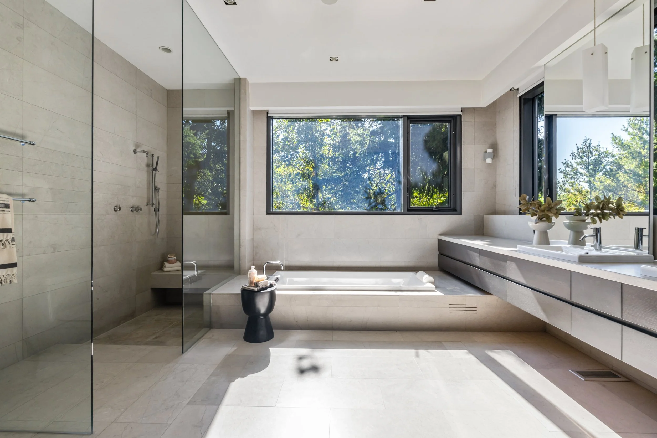 Experience an unparalleled blend of sleek, modern elegance and comfort in this spectacular Chaplin Estates residence. This rectilinear architectural marvel is a sensational contemporary glass, steel, and hand finished stone home offering 5,227 square feet of extraordinary, Zen-like sophistication across all three levels. Enter through the custom front door to meticulously designed interiors by Studio Pyramid, where every detail has been thoughtfully considered. Enormous commercial grade curtain wall windows and skylights flood the interior with an abundance of natural light, forging a deep connection to the surrounding landscape.
