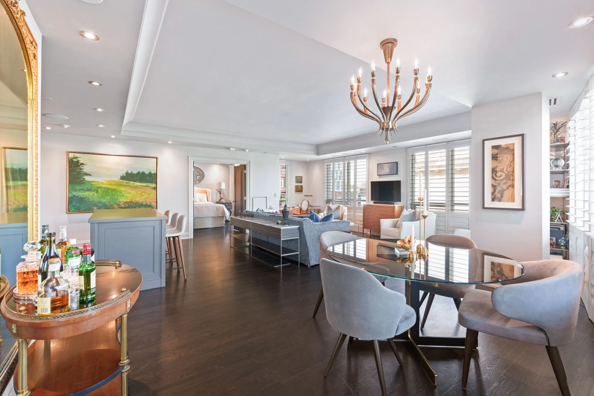The very epitome of sophistication. From the moment you enter your suite, you have the sensation of calm and well being. Open concept renovated kitchen, living, and dining in one massive space. Beautiful Oak flooring throughout. The updated kitchen features soapstone countertops, British-style in-frame cabinetry, and high-end appliances.