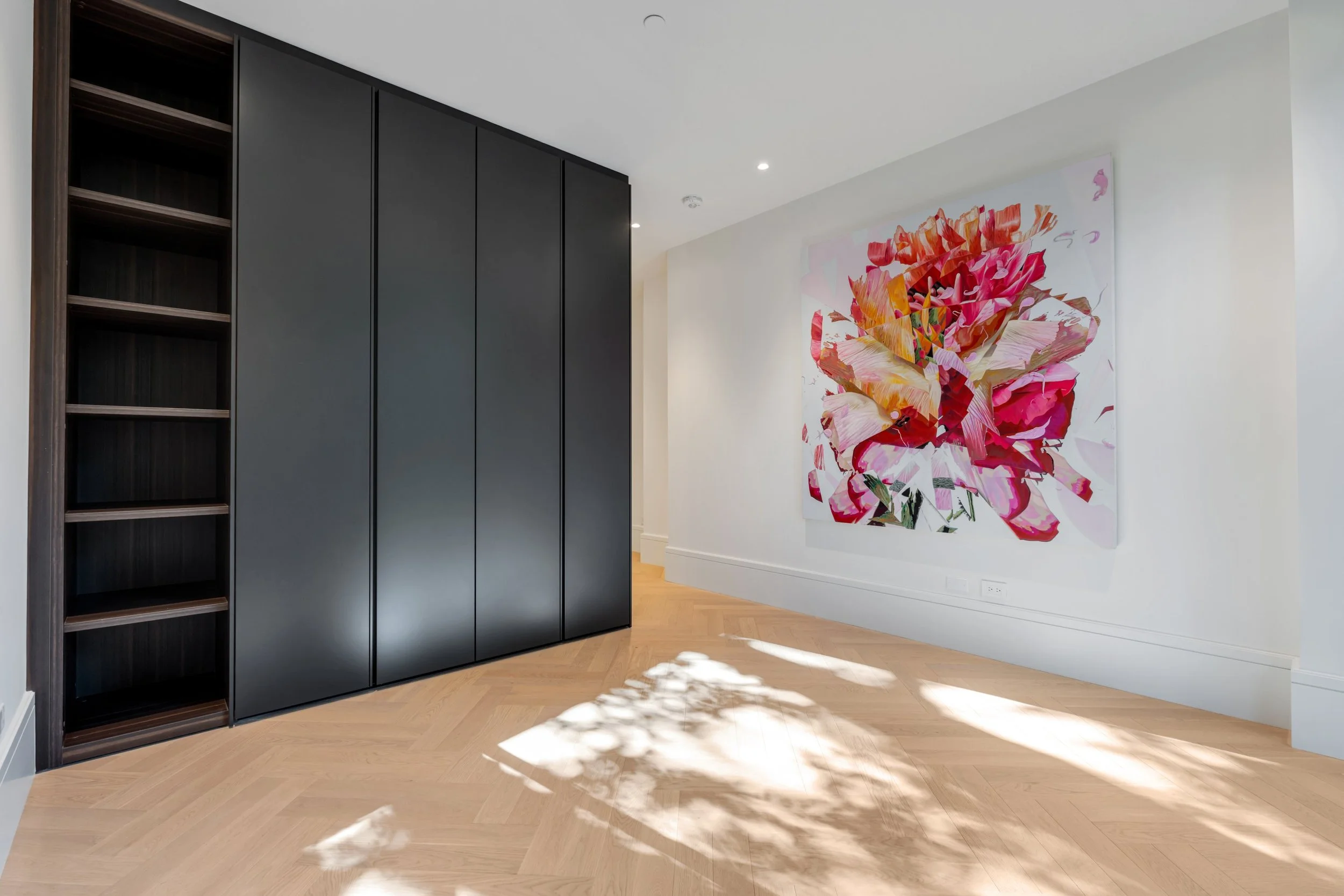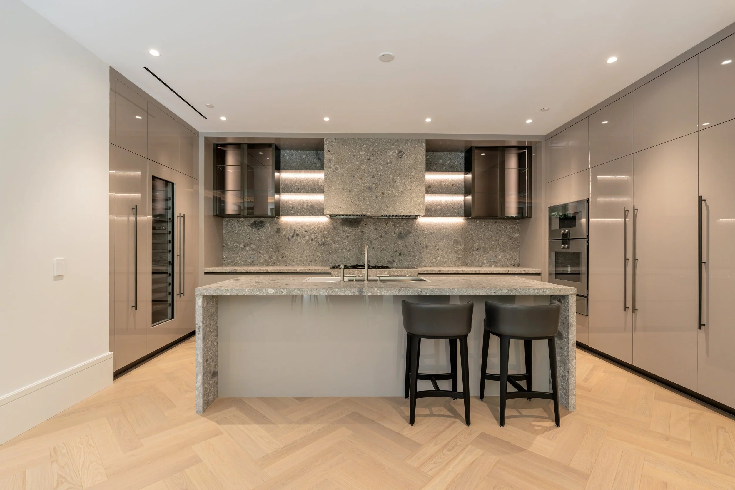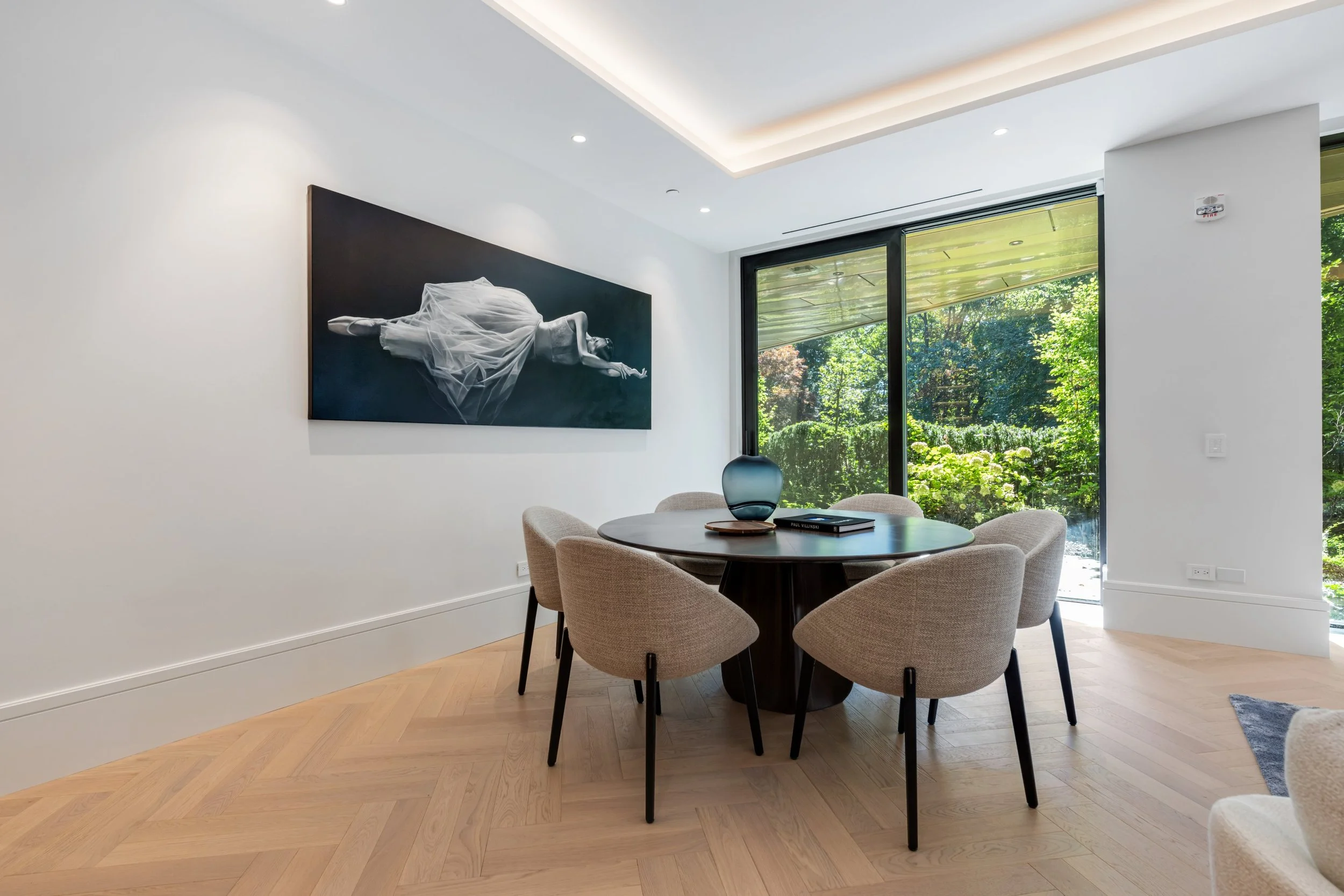 Prepare to be captivated by the elegant, open-concept living / dining / kitchen space. It boasts soaring ten-foot ceilings, rich herringbone flooring, and a chic fireplace, creating an atmosphere of polished comfort. The luxurious DaDa/Molteni cook's kitchen is an epicentre for lively gatherings, fully fitted with a suite of high-end Gaggenau appliances and anchored by a substantial central island with a breathtaking quartzite countertop. A piece of art in its own right.