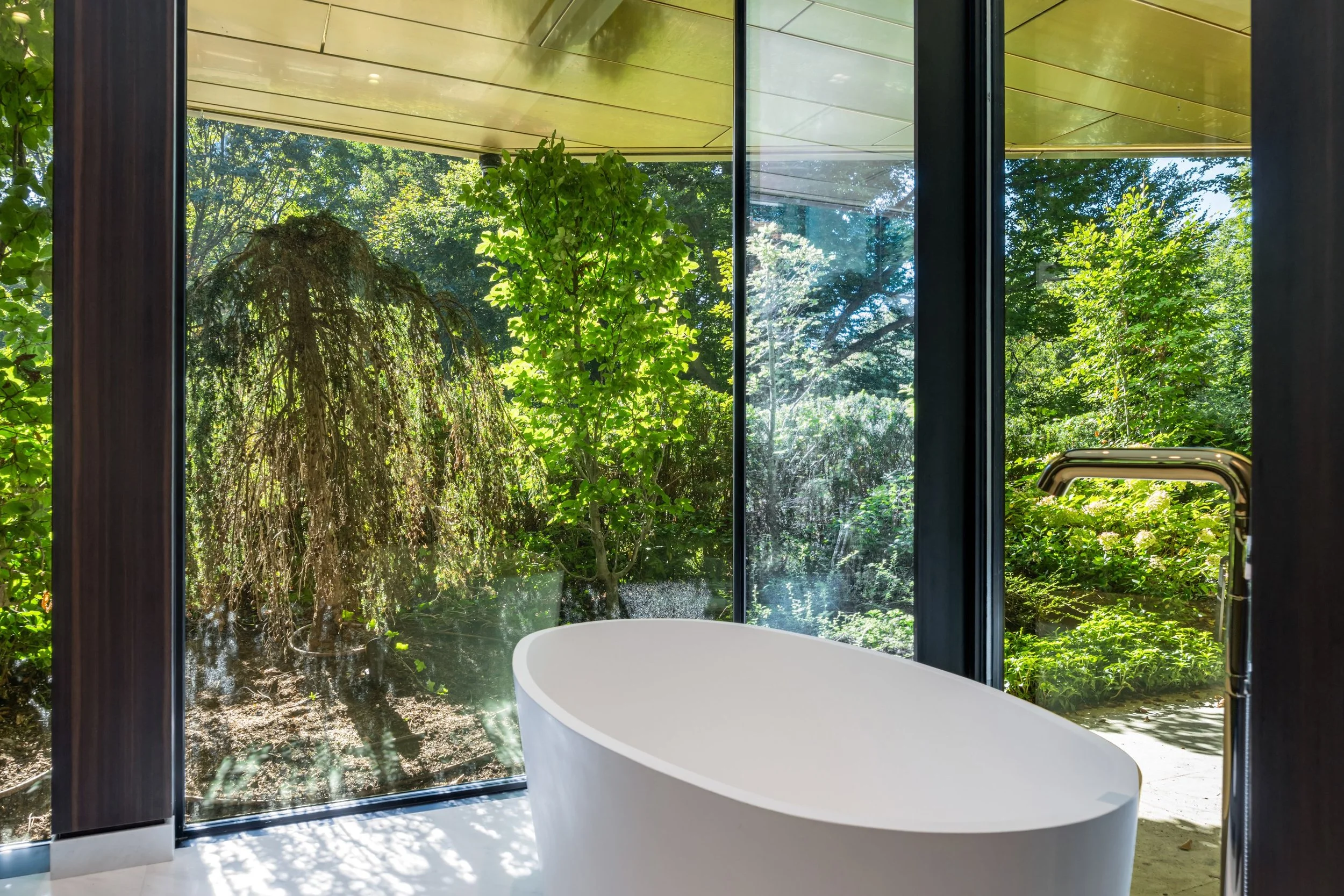 The expansive architectural curtain wall expertly frames the lush surrounding greenery, while ample wall space offers the perfect setting to display your most cherished art collection. Privacy is paramount, with the primary suite and guest bedroom situated at opposing ends of the apartment. Superbly appointed baths.