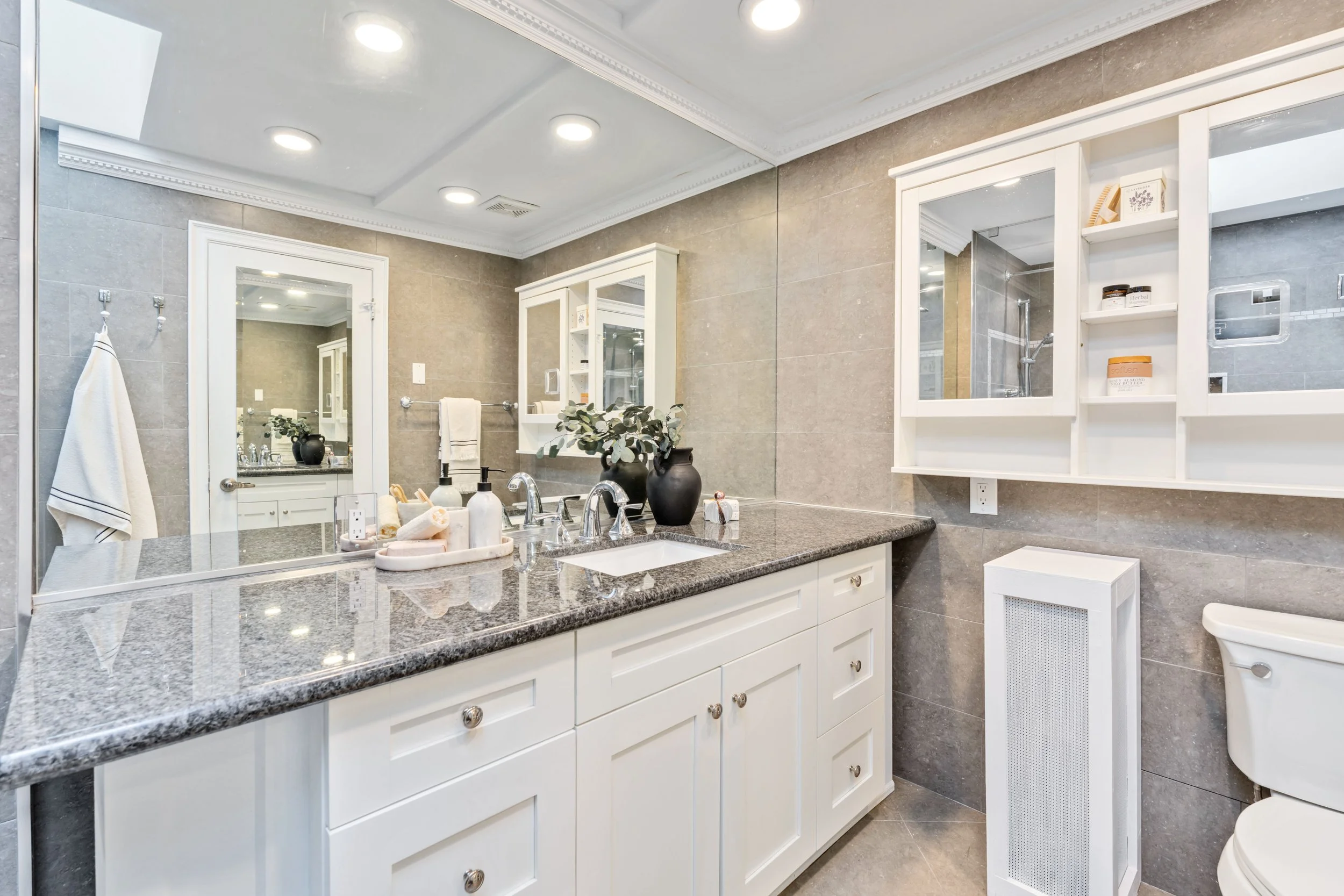 The second floor hosts four well-appointed bedrooms and two bathrooms. The primarysuite (part of the 1993 addition) includes a walk-in closet and a luxurious ensuite bathroom that is brilliantly illuminated by a skylight.