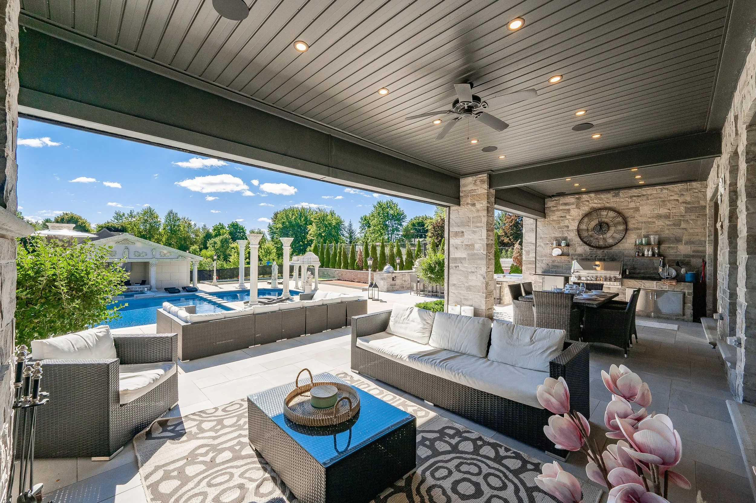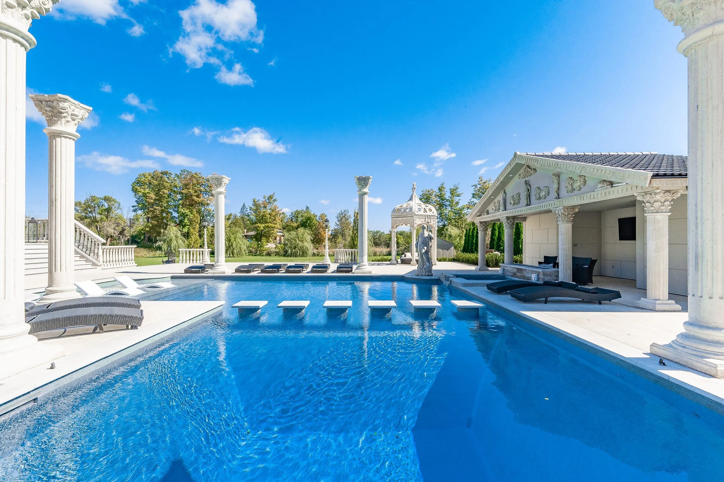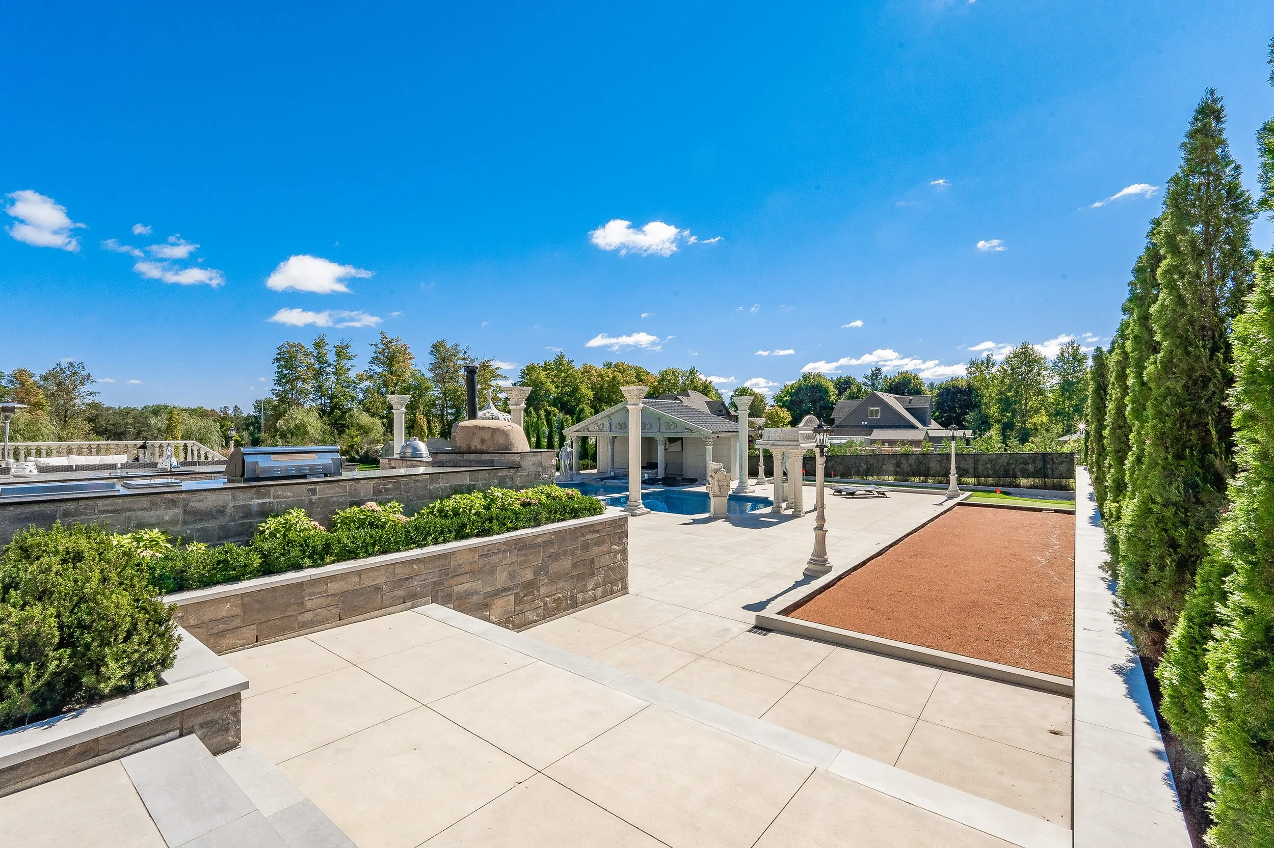 An impressive country estate to host parties for friends and family, just like at a resort, this summer. The backyard is nothing short of an entertainer’s dream come true. Jaw dropping outdoor living is the ultimate space for entertaining like nothing seen before. Play tennis or basketball in the sports court, bocce in the ball court, or golf putting on the green. The unbelievable custom in-ground pool, with integrated hot tub, is surrounded by cast stone columns. Massive covered and open patios and seating areas, fireplaces, and cabana. Fully equipped outdoor kitchen with pizza oven and separate built-in BBQ area. Fountains, koi pond, gardens and pergola. The setting is straight out of a deluxe Hollywood movie shoot.