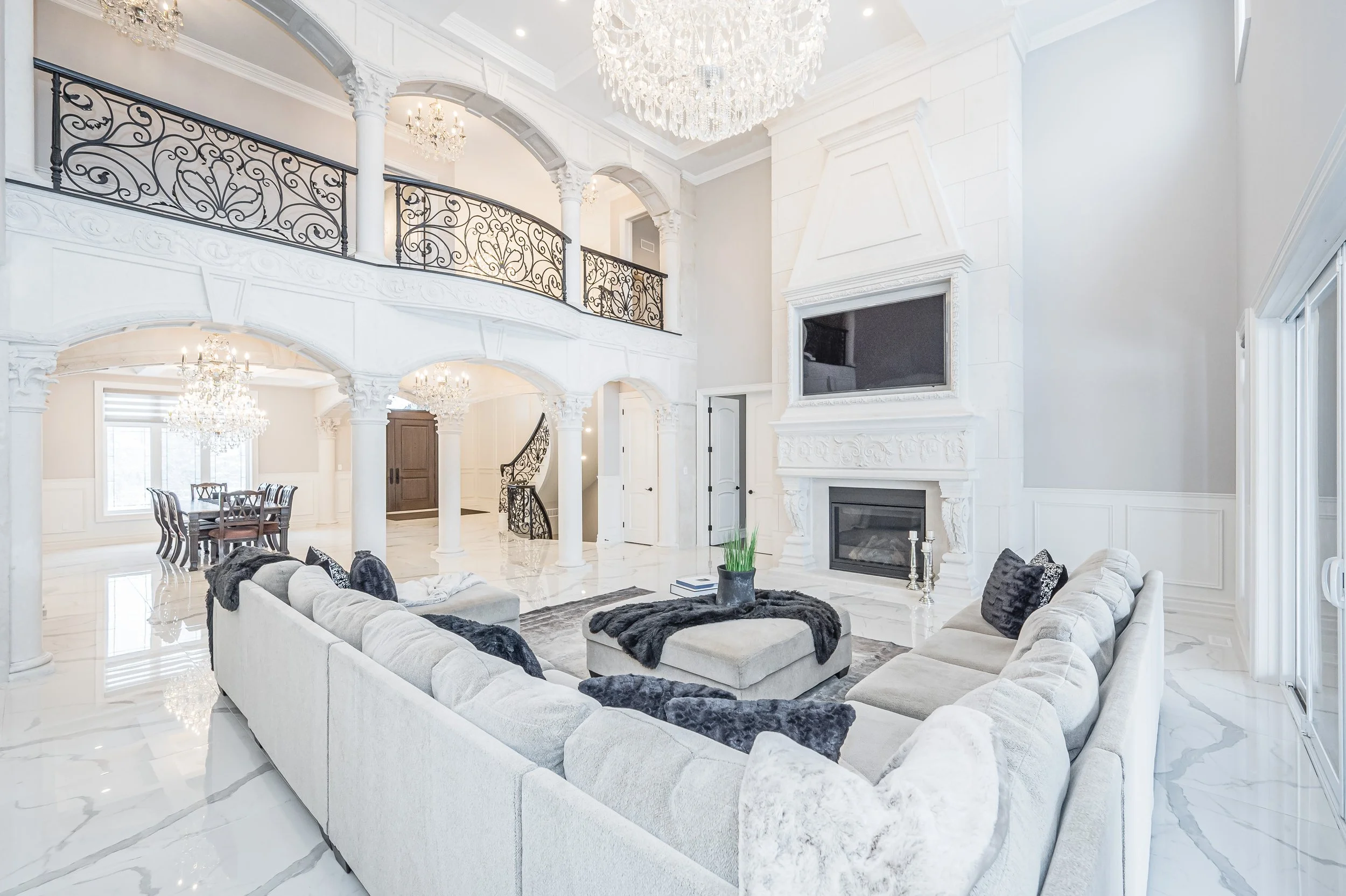 Finished on a regal scale and custom built down to the last detail. Very few homes can boast the same extravagant finishes found in this majestic property. Incredibly spacious open concept main floor design features two-storey ceilings accented by intricate Romanesque inspired architecture with cast limestone columns, archways and floor-to-ceiling Great Room fireplace mantel. Wainscotting, coffered ceilings and crystal chandeliers adorn the principal rooms and grand hallways. Italian custom designed kitchen is outfitted with built-in appliances, island with breakfast bar seating, hidden pantry and servery. Main floor Primary Bedroom wing features a walk-out to a private rear patio, fireplace, walk-in closet and luxurious ensuite like no other.